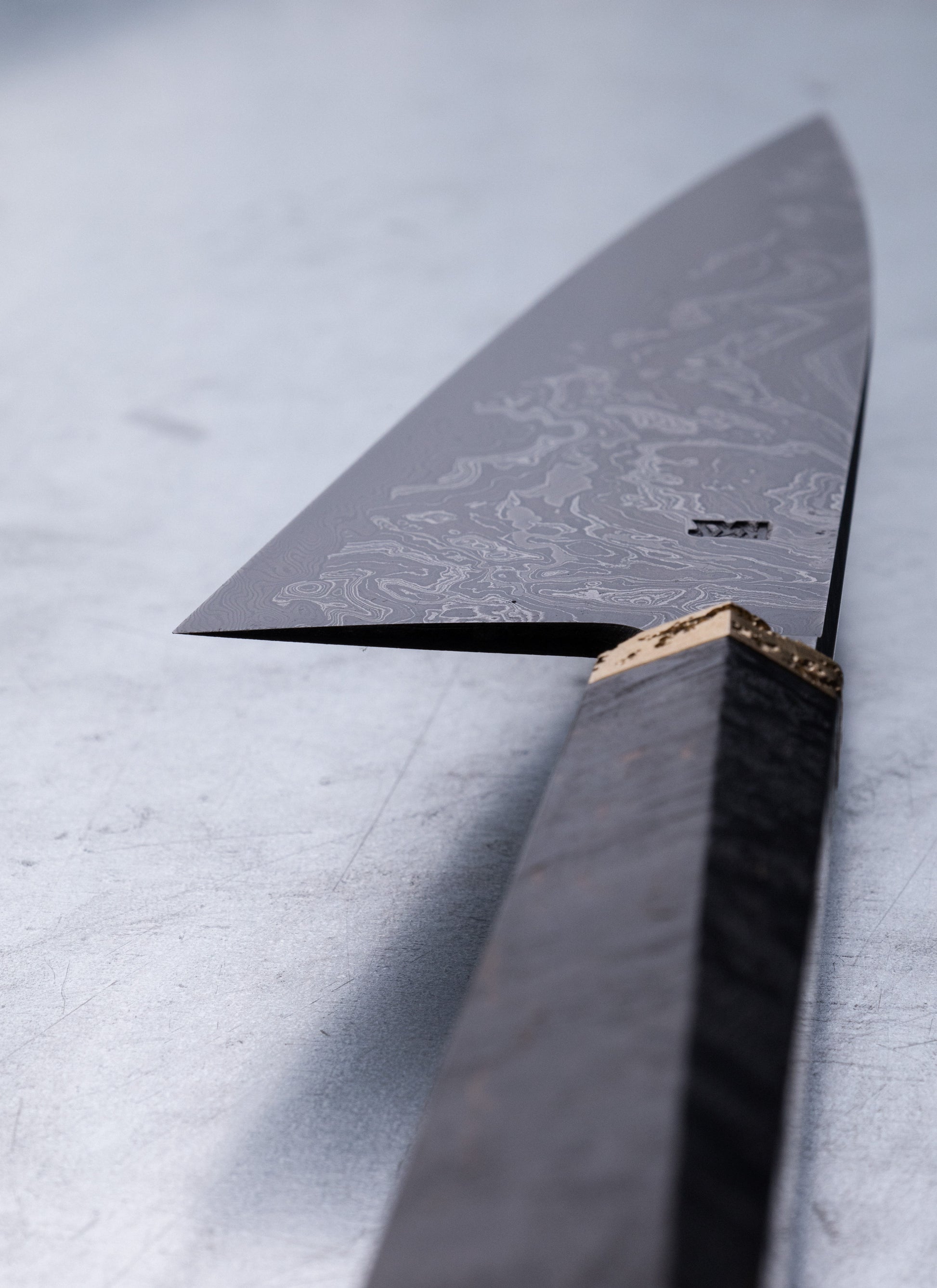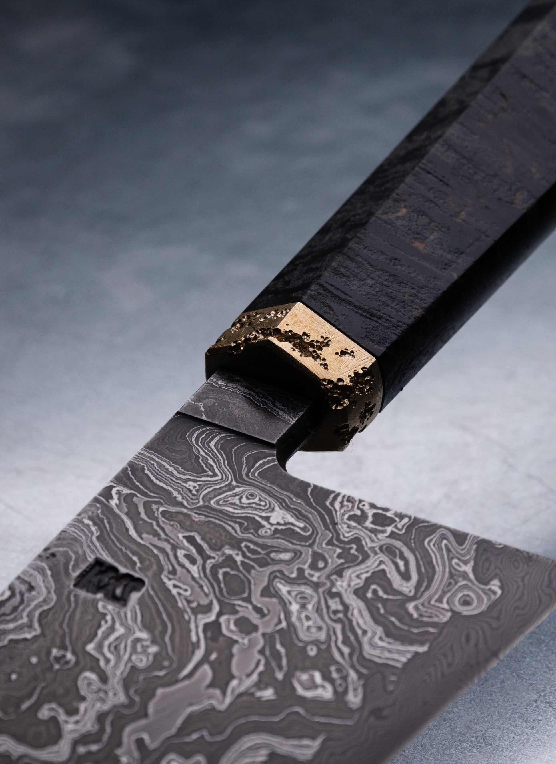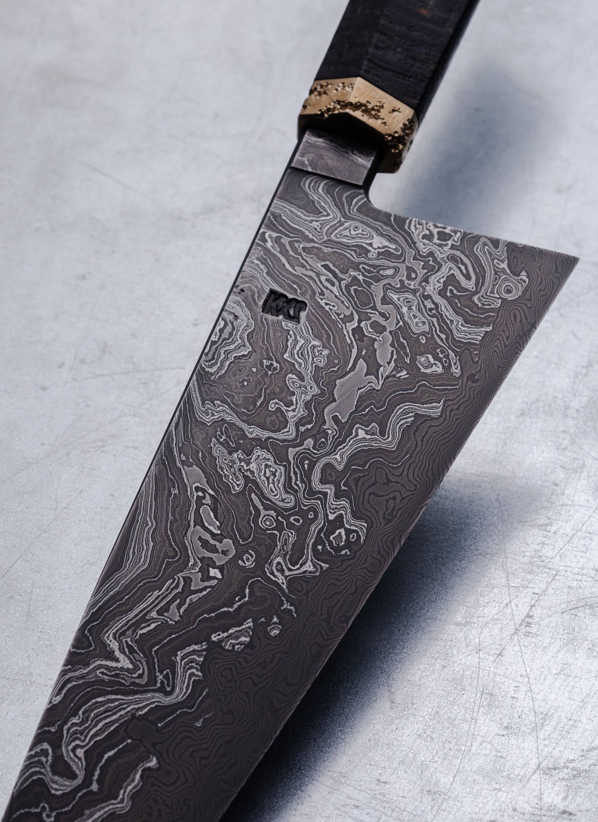 - house-made carbon steel damascus core (mainly 1.2419) with softer damascus cladding, total of ~800 layers