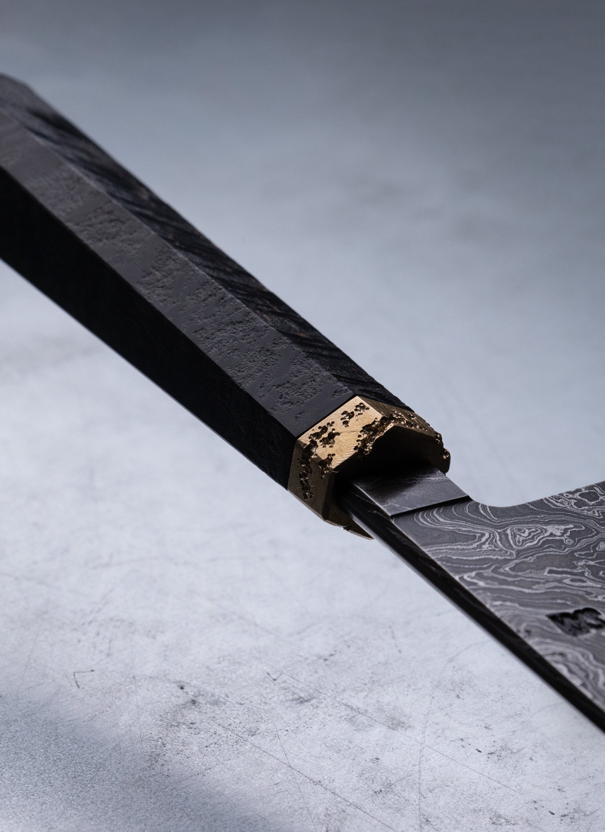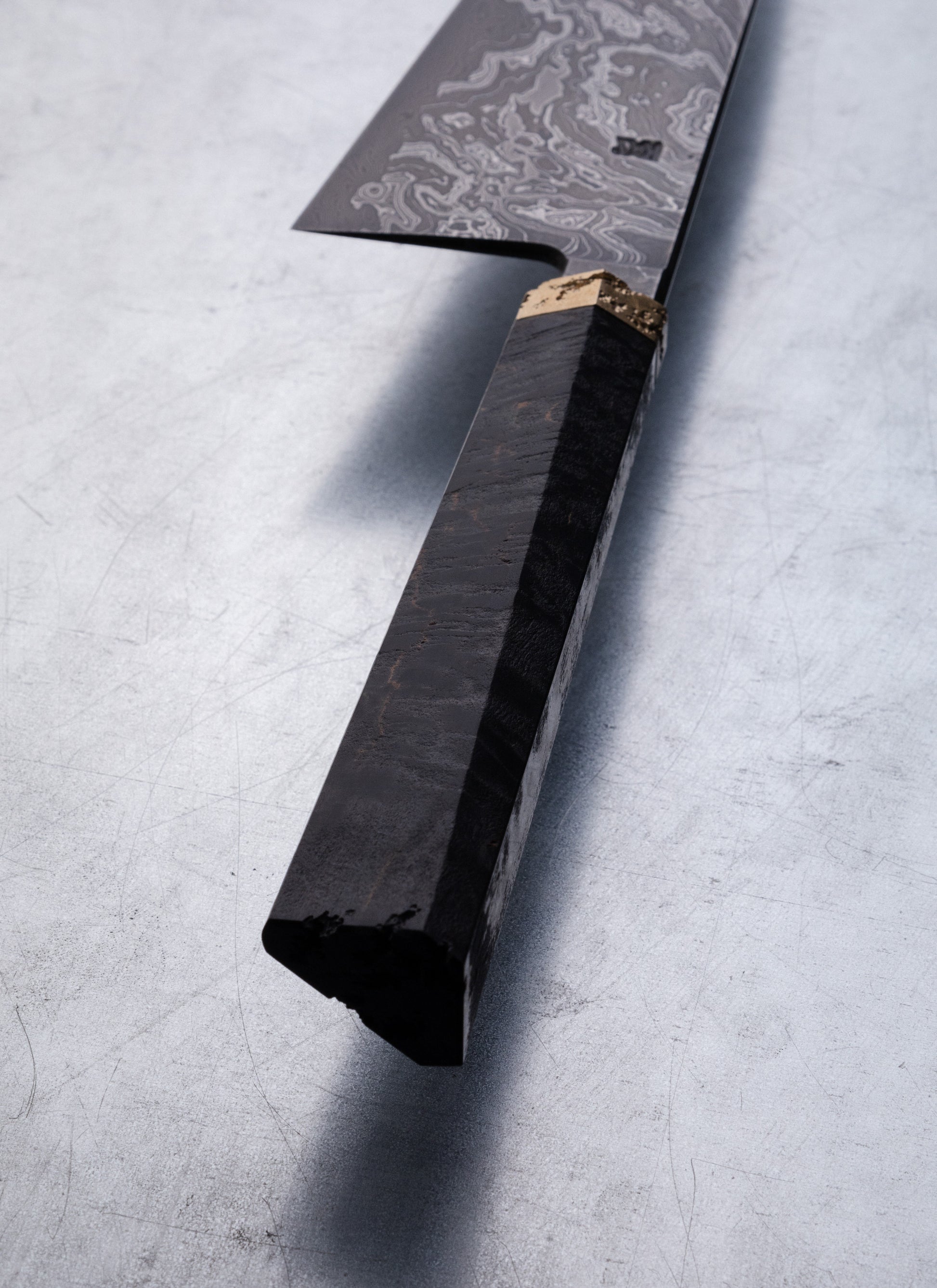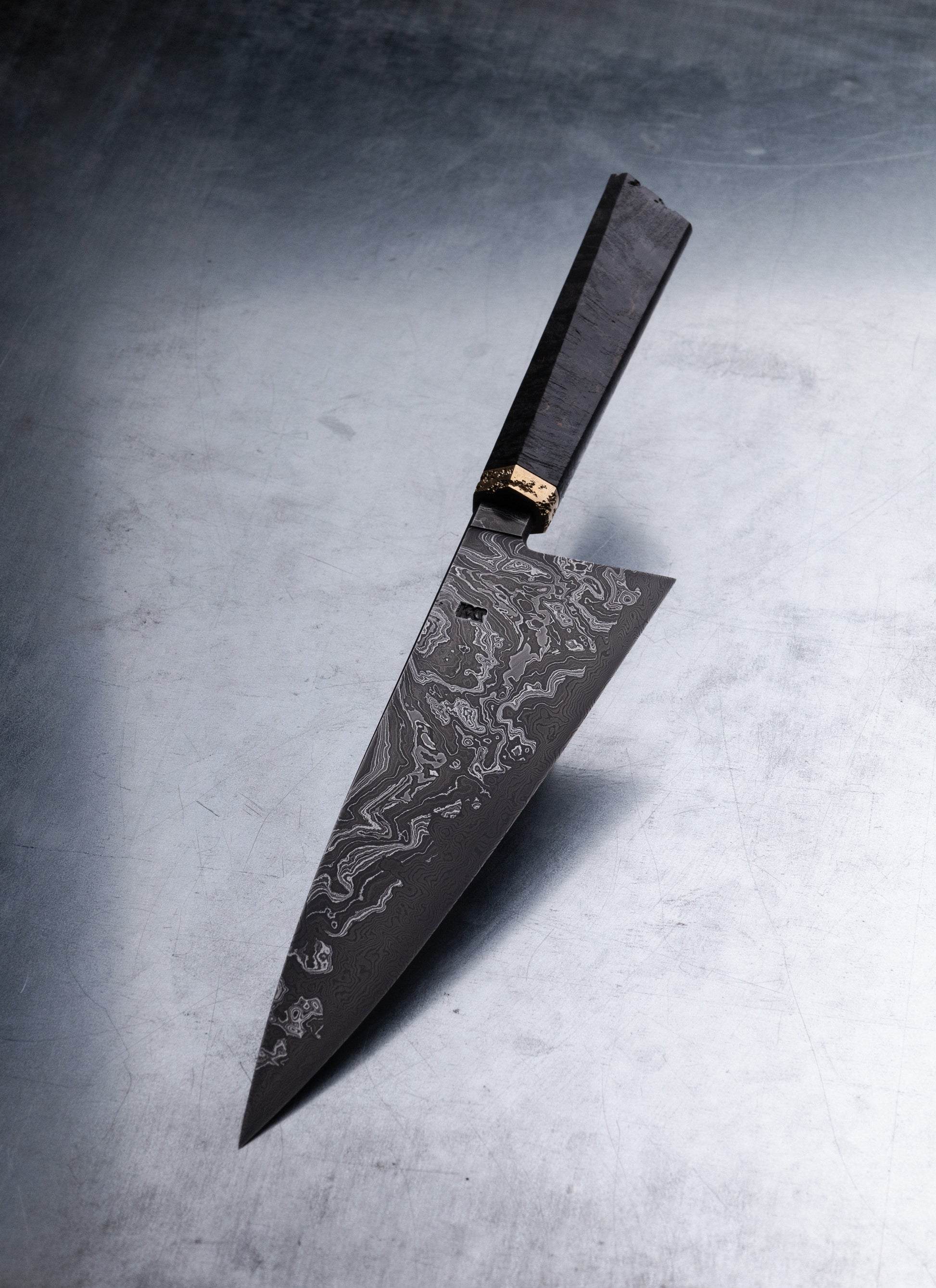 - house-made carbon steel damascus core (mainly 1.2419) with softer damascus cladding, total of ~800 layers